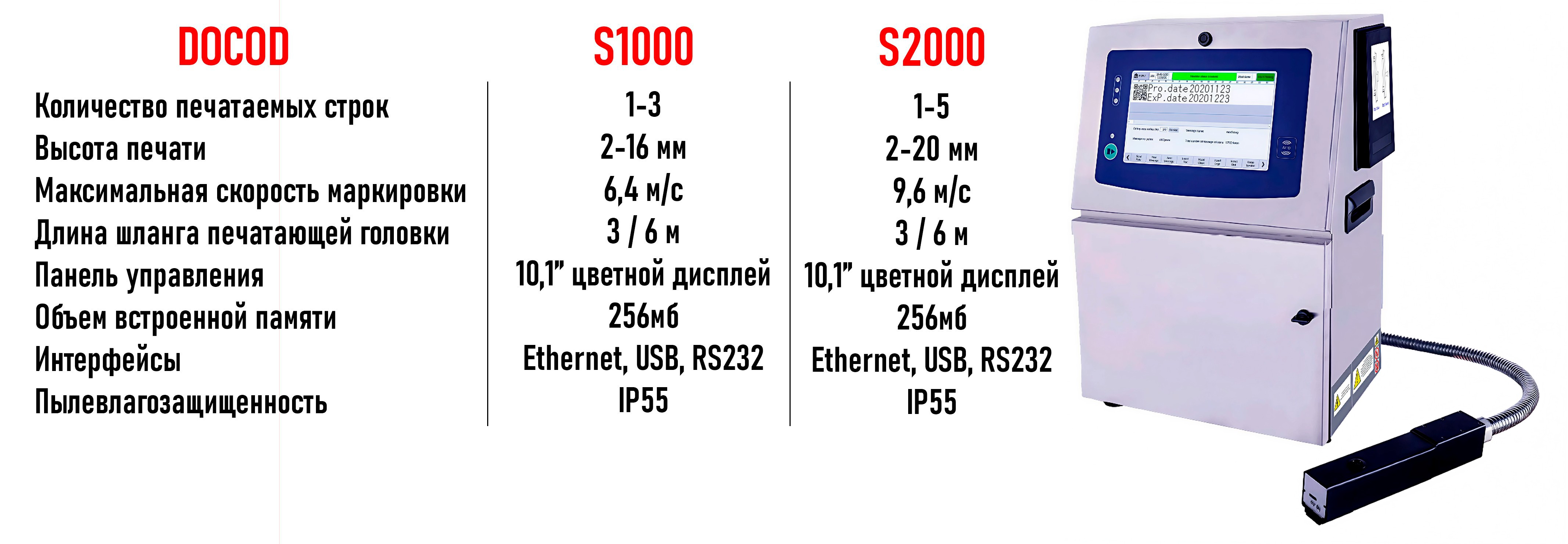 DOCOD S1000 – это каплеструйный принтер для производственных линий средней скорости, поддерживающий до 3 строк печати со скоростью до ~384 м/мин (6,4м/с). Он обеспечивает чёткое нанесение дат, номеров партий, штрих- и 2D-кодов на движущийся продукт.